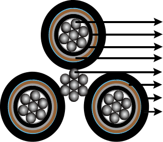 Assembly: Three XLPE insulated screened cores are bundled around the galvanized steel wires in a right hand lay.